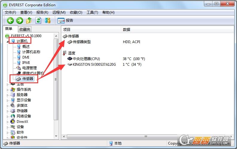 还是在“计算机”里,点击“传感器”即可详细显示主板、CPU、硬盘的温度及CPU的电压。